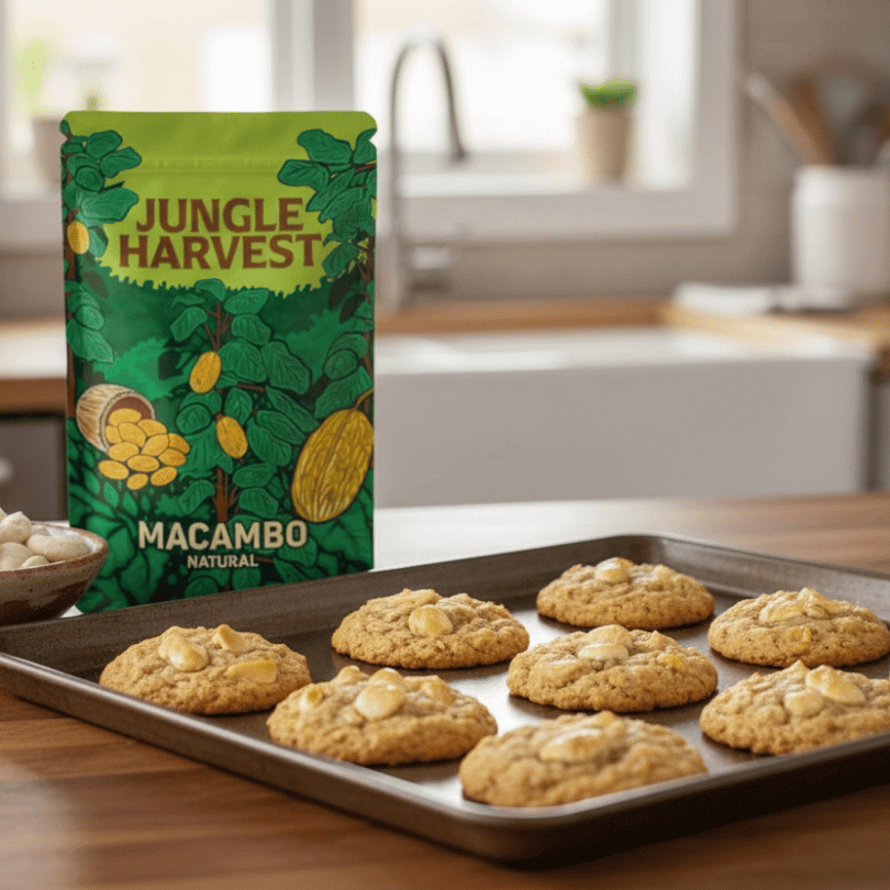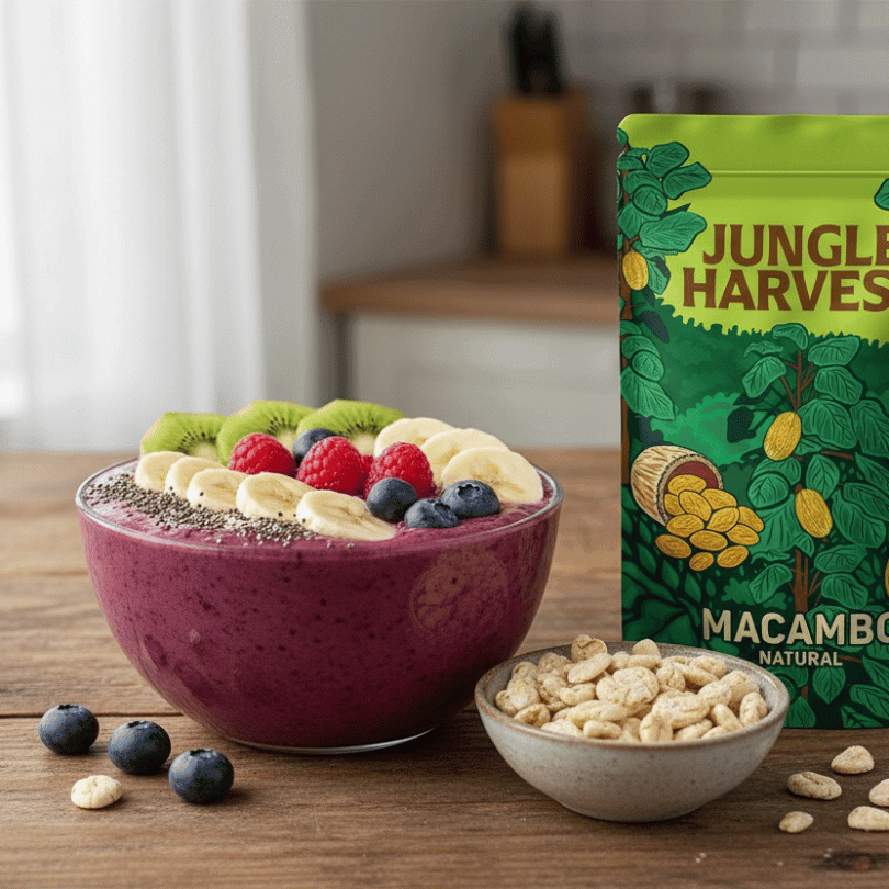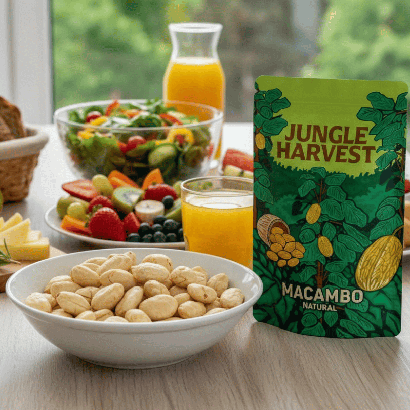 Macambo ist reich an pflanzlichem Eiweiß (20-25g), gesunden Fetten, Ballaststoffen (ca. 46g), Kalium und natürlichen Antioxidantien.