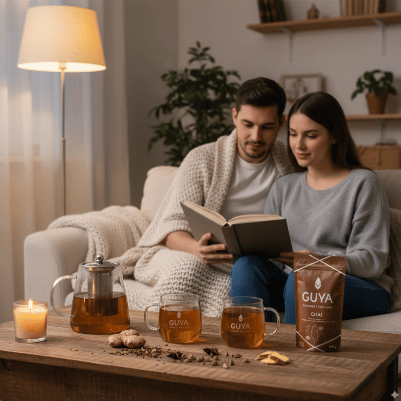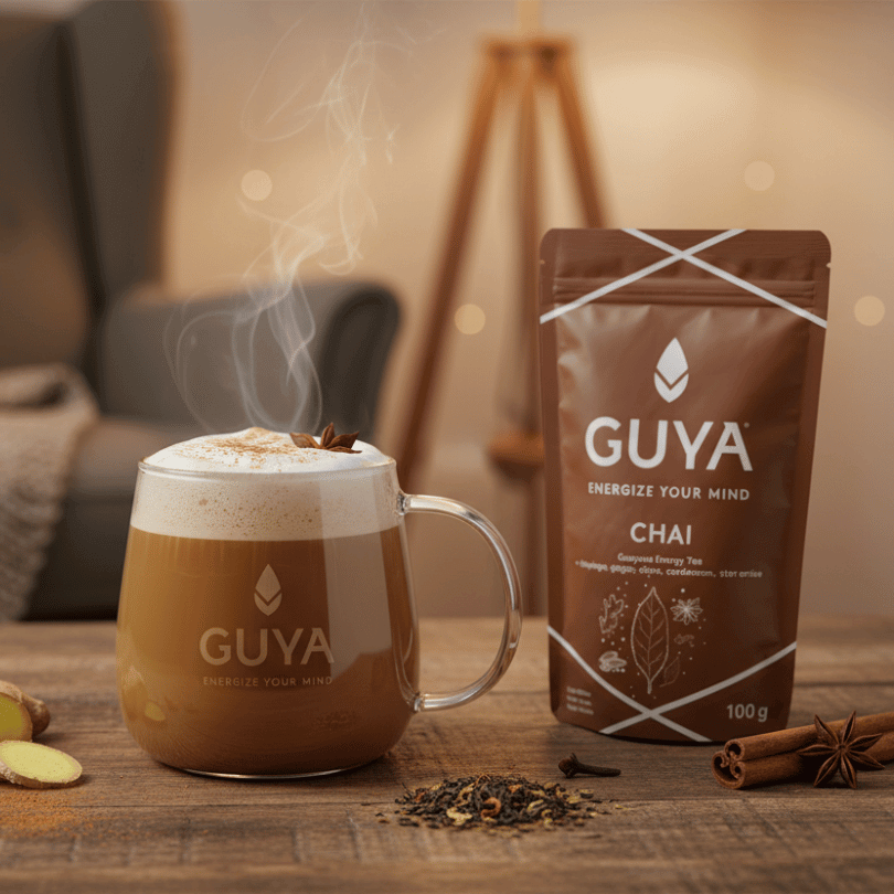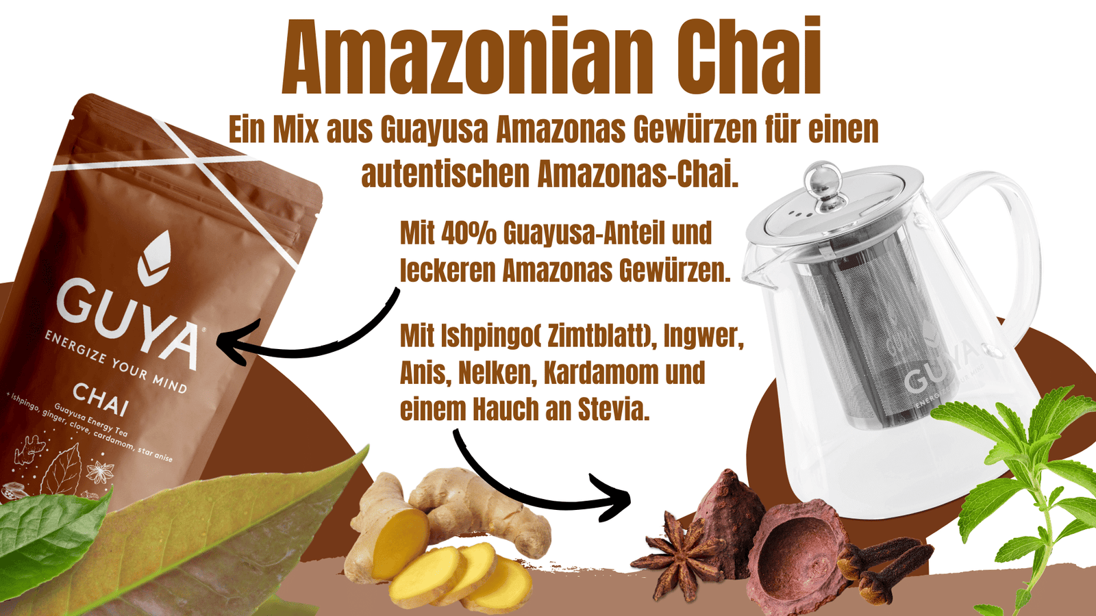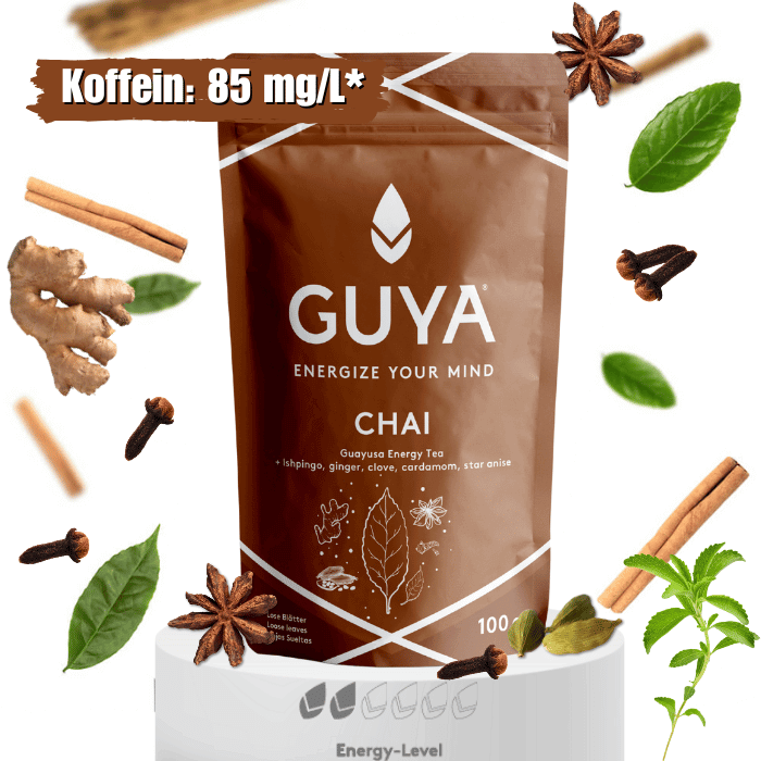 Unsere Chai-Mischung enthält 40 % Guayusa und ist damit ein eher sanfter Wachmacher.
